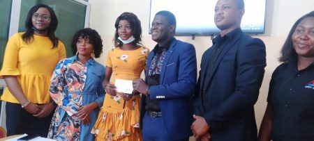 Miss Faith Adebisi, one of the beneficiaries of the Gtext Homes initiative, receiving a cheque of N1m prize money from the CEO Gtext Homes, Dr Stephen Akintayo at a ceremony in Lagos.