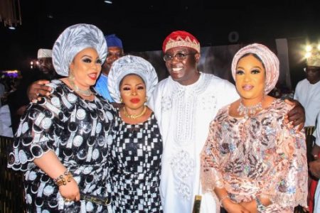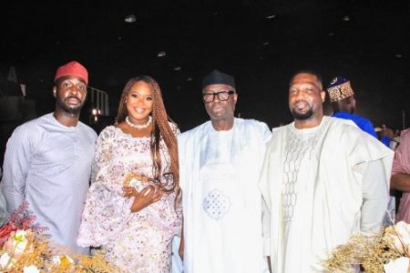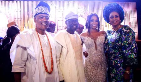 L-R: Chairman of the Occasion and Governor of Lagos State, Mr Babajide Sanwo-Olu; Bride, Alimah Seriki Araoye; Groom, Mr Makinde Araoye and CEO of Eleganza Industry, Chief Dr. Folashade Okoya
