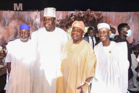 L-R: Father of the Bride, Amb Demola Seriki; Chairman of the Occasion/Governor, Lagos State, Mr. Babajide Sanwo-Olu; Bride, Alimah Araoye and Mother of the Bride, Alhaja Wosilat Seriki
