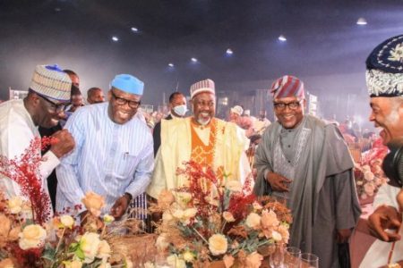 L-R: Governor Godwin Obaseki of Edo State; Governor Kayode Fayemi of Ekiti State; Governor Muhammad Badaru of Jigawa State; Chairman of Dangote Group, Alh Aliko Dangote and Father of the Bride, Amb. Demola Seriki