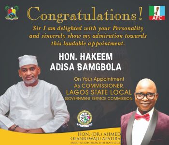 The Executive Chairman of Itire-Ikate LCDA, Hon. (Dr.) Ahmed Olanrewaju Apatira heartily Congratulate the Lagos Central APC Vice-Chairman and Former Executive Chairman, Itire-Ikate LCDA, Hon. Hakeem Adisa Bamgbola on this well deserved Appointment by Governor Babajide Sanwo-Olu, as Honourable Commissioner of the Lagos State Local Government Service Commission.