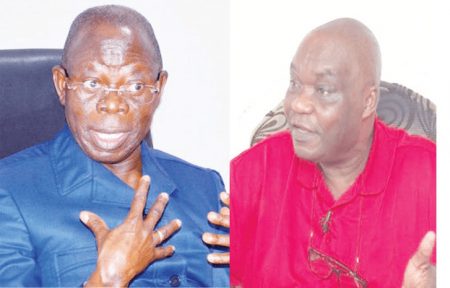 L-R: National Chairma, All Progressives Congress (APC), Comrade Adams Oshiomhole and A Chieftain of the Edo State APC, Charles Idahosa