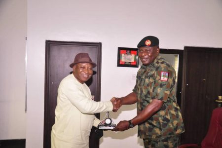 L-R: Interim Administrator, Presidential Amnesty Programme (PAP), Col. Milland Dixon Dikio (rtd) Presenting a souvenir to the General Officer Commanding, GOC 6 Division, Nigerian Army, Maj. Gen. O.O Oluyede