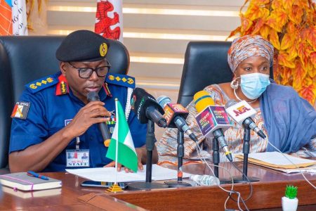 L-R: Commandant General, NSCDC, Dr Ahmed Abubakar Audi with the Secretary, The Civil Defence, Correctional, Fire and Immigration Services Board (CDCFIB), Mrs Aisha Rufai during the press briefing at the Corps’ Headquarters, Abuja