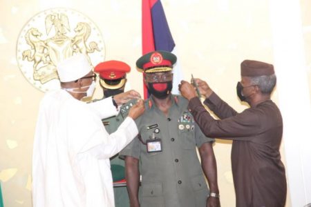 Speaking shortly after his decoration, the COAS expressed his appreciation to the President for appointing him to serve and command the Nigerian Army as the 22nd COAS. He pledged to discharge his duties professionally and diligently with utmost respect for the fundamental rights of the citizenry. Lieutenant General Yahaya also assured the President of his loyalty to the Constitution and Government of the Federal Republic of Nigeria.