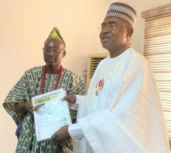 L-R: President – General, Agbarijo Egbe Odo Yoruba (Grand Council of Yoruba Youths), Comrade AWA Bamiji Receiving NDLEA’s Magazine from the Chairman/CEO of NDLEA, Brig Gen Buba Marwa Rtd