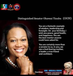 Ikosi-Isheri council boss Princess Samiat Abolanle Bada said:”Your name resonates, not just as?a politician; you are a quintessential mother, a model to celebrate and an enviable beacon of hope.”