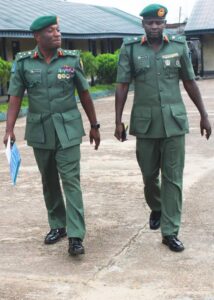 L-R: Outgoing Commandant, Nigerian Army Intelligence School, Major General IG Lassa Handing over to the New Commandant, Nigerian Army Intelligence School, Brigadier General KN Nwoko