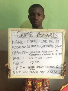 “Also on 28/8/2021, the command Crack squad raided criminal hideout in Ozoro community where two suspects namely Cyril Enishoke ‘m’ age 20yrs and Oghogho Joseph ‘f’ age 32yrs were arrested and large quantity of substance suspected to be Indian hemp was recovered from them. Investigation is ongoing.”