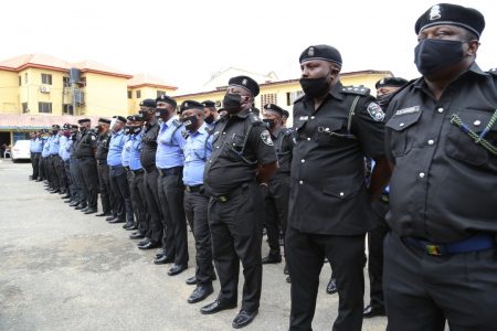 Personnel of the disbanded Special Anti Robbery Squad, Anti Kidnapping Squad, Anti Cultism Squad and Raider in Lagos State at the Command Headquarters, Ikeja.