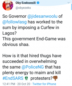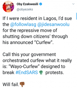 EZEKWESILI SLAMS SANWO-OLU OVER CURFEW, CALL IT ‘REPRESSIVE MOVE TO SHUT DOWN PROTESTS’