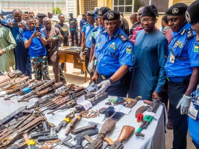 Others are 2 Dane guns, 116 rounds of 7.62mm live ammunition, 102 rounds of .9mm live ammunition, 7 live cartridges and one (1) expended cartridge shell, 7 locally made pistols, 4 locally made shotguns, 3 axes, 4 cutlasses, 15 daggers, 9 pairs of scissors, 31 bottles of codeine syrup.