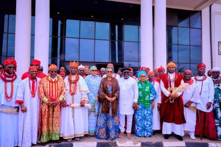 L-R: Pere of Akugbenemien Kingdom, HRM Pere Stanley Pere-Degha Luke; Orodje of Okpe, HRM Major General Felix Mujak Peruo; wife of the Vice President, Hajia Nana Shettima; First Lady of Nigeria, Senator Oluremi Tinubu; Governor of Delta State, Rt Hon Sheriff Oborevwori; his wife Deaconess Tobore Oborevwori and the Olu of Warri Kingdom, HRM Ogiame Atunwase and other royal fathers in Asaba, Delta State when the First Lady visited the Traditional Rulers in the State as part of her 2-day visit to the State on Tuesday 25th March, 2025.