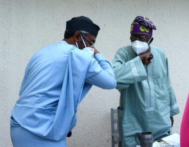 L-R: Speaker Femi Gbajabiamila in elbow shake with Asiwaju Bola Tinubu