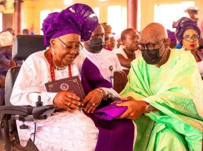L-R: Lady Evangelist Grace Akeredolu and Her Son/Governor, Ondo State, Arakunrin Oluwarotimi Akeredolu,SAN during her 90th Birthday Thanksgiving Service at St. Mathias’ Anglican Church, Orogun, Ibadan, Oyo State.