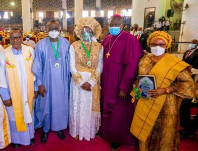 L-R: Southwest Chairman, Christian Association of Nigeria (CAN), Revd. Father Raphael Osegboun; Lagos State Governor Babjide Sanwo-Olu; Reverend Mother Esther Ajayi; Chairman, CAN Lagos State Chapter, Rt. Reverend Stephen Adegbite and Mrs. Otitonaye Fadeke represented federal lawmaker in the Senate (Lagos Central), Senator Oluemi Tinubu, during Lagos CAN Interdenominational Divine Service organized at the Apostolic Church, Ketu, on Saturday, February 20, 2021.