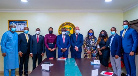 Lagos State Governor, Mr. Babajide Sanwo-Olu (fifth left) and Acting Consul-General, Kingdom of the Netherlands in Lagos, Mr. Arie Plieger (fifth right), flanked by the Special Adviser to the Governor on SDGs and Lagos Global, Mrs. Solape Hammond (fourth right); Senior Special Assistant to the Governor on Diaspora and Foreign Relations, Mr. Jermaine Sanwo-Olu (right); Deputy Governor, Dr. Obafemi Hamzat (third left); Commissioner for the Environment and Water Resources, Mr. Tunji Bello (second left); his counterpart for Economic Planning and Budget, Mr. Sam Egube and entourage of the Acting Consul-General, during a meeting with the Governor at Lagos House, Alausa, on Wednesday, March 10, 2021.