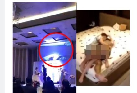 As they all look up to the big LED screen behind the couple on the stage, the guests were shocked when they see the bride kissing another man in a bedroom.