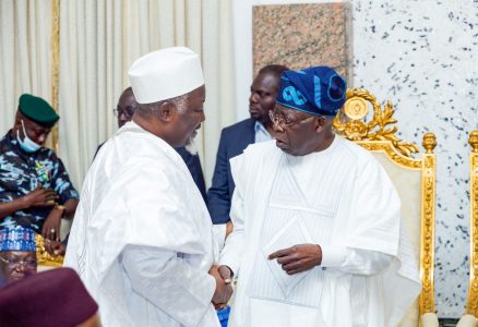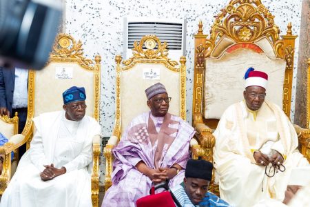 L-R: Presidential Candidate, All Progressive Congress, APC, Asiwaju Bola Ahmed Tinubu; Chief of Staff to President Buhari, Prof. Ibrahim Gambari and Shehu of Borno, Alhaji Abubakar Ibn Umar Garbai Elkanemi during the wedding ceremony between the Daughter, Fatima Shettima of APC Vice Presidential Candidate, Sen. Kashim Shettima and the Son of former FCT Minister, Ibrahim Bunu at Maiduguri, Borno state, on Saturday