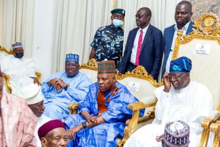 L-R: Senate President, Sen. Ahmed Lawan; Father of the Bride and APC Vice Presidential Candidate, Sen. Kashim Shettima; Presidential Candidate, All Progressive Congress, APC, Asiwaju Bola Ahmed Tinubu; Chief of Staff to President Buhari, Prof. Ibrahim Gambari and Shehu of Borno, Alhaji Abubakar Ibn Umar Garbai Elkanemi during the wedding ceremony between the Daughter, Fatima Shettima of APC Vice Presidential Candidate, Sen. Kashim Shettima and the Son of former FCT Minister, Ibrahim Bunu at Maiduguri, Borno state, on Saturday