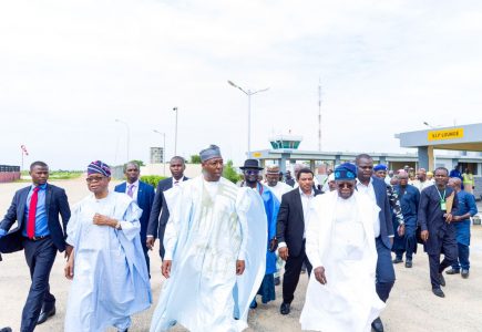 L-R: Chairman, Dangote Group, Alhaji Aliko Dangote; Senate President, Sen. Ahmed Lawan; Father of the Bride and APC Vice Presidential Candidate, Sen. Kashim Shettima and Presidential Candidate, All Progressive Congress, APC, Asiwaju Bola Ahmed Tinubu during the wedding ceremony between the Daughter, Fatima Shettima of APC Vice Presidential Candidate, Sen. Kashim Shettima and the Son of former FCT Minister, Ibrahim Bunu at Maiduguri, Borno state, on Saturday