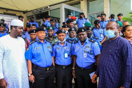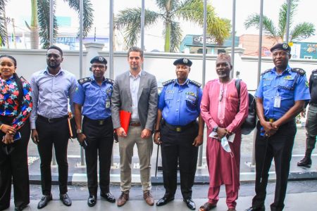 L-R: Commissioner of Police, Lagos State Command, CP Hakeem Odumosu; Assistant Inspector General of Police, Zone 2, AIG Johnson Kokumo; Inspector General of Police, IGP Usman Alkali Baba; Head of Component, German Development Cooperation (GIZ Nigeria), Gertjan de Gruijter; Assistant Inspector General of Police, In Charge of Cooperative, AIG Adamu Usman and Board Member, Lagos State Security Trust Fund (LSSTF), Dr. Ayo Ogunsan during the Flagg-off of a 3-Day Capacity Building Workshop for Police PROs in Lagos.