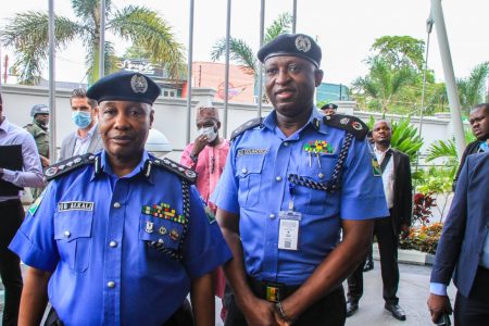 L-R: Inspector General of Police, IGP Usman Alkali Baba and Commissioner of Police, Lagos State Command, CP Hakeem Odumosu at the Flagg-off of a 3-Day Capacity Building Workshop for Police PROs in Lagos.