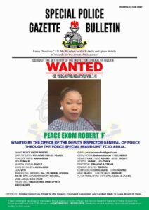 ‘After realizing that the police were coordinating the case harmonization with the EFCC, the suspect ceased contact with them. Peace Ekom Robert was thereafter declared wanted alongside Ndiana Abasi who came forward and clarified his position in the matter and was there upon cleared by the Police. The suspect, Peace Ekom, was