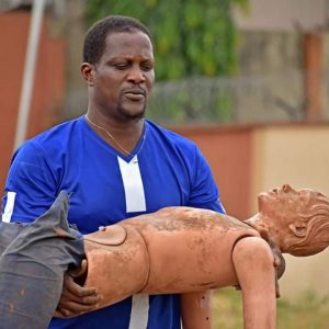 Director General, Lagos State Law Enforcement Training Institute (LETI), Mr Ifalade Oyekan displaying an artificial human object during the training of new Central Business District (CBD) Enforcement Officers.