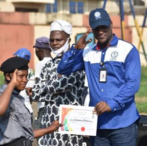 Director General, Lagos State Law Enforcement Training Institute (LETI), Mr Ifalade Oyekan (right) Presenting Training Certificate to one of the Newly Trained Central Business District (CBD) Enforcement Officers.