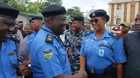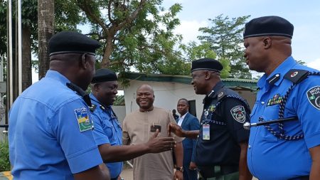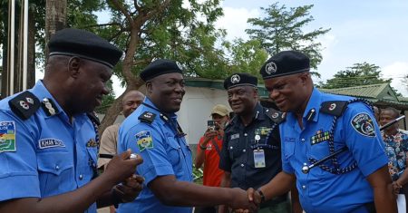 L-R: DC Admin, Lagos Command, DCP Khan Salihu; Commissioner of Police, Lagos State Command, CP Tijani Fatai; ES/CEO, LSSTF, Dr. Ayo Ogunsan; AC Operations and ACP Aka Shittu during the resumption of CP Fatai Tijani at the Lagos Command Headquarters IkejaL-R: CP Tijani Fatai in a warm handshake with ACP Aka Shittu during his resumption of duty at Lagos Command’s Headquarters Ikeja…