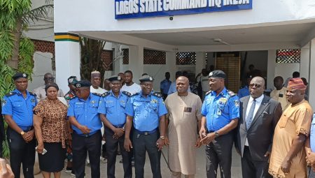 L-R: Deputy Commissioner of Police, DC Admin, Lagos Command, DCP Khan Salihu receiving the new Commissioner of Police, Lagos State Command, CP Tijani Fatai to the Command’s Headquarters IkejaSenior Officers of the Lagos Command; ES/CEO LSSTF, Dr. Ayo Ogunsan and other guests waiting to receive the new Commissioner of Police, CP Tijani Fatai at the Command’s Headquarters Ikeja…