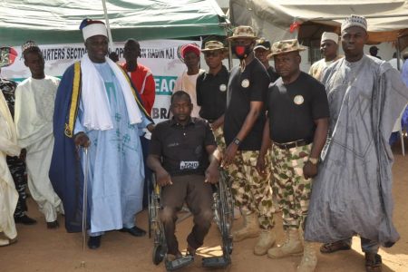 Medical services offered during the exercise include general outpatient consultation, treatment of common ailment/diseases, health education, eye check, dental check, distribution of treated mosquito nets and drugs, distribution of blankets, HIV counselling, distribution of malaria repellants and palliatives. The high point of the exercise was the presentation of a wheelchair to disabled patient by the Command Sector 2 Operation HADIN KAI.
