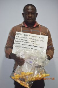 The 41-year-old suspect who was arrested on Wednesday, 25th August, 2021, upon his arrival on board an Ethiopian Airline flight 911 from Kigali via Addis Ababa was taken in for secondary check during which he tested positive to ingestion of illicit substance. While under observation, he excreted 87 pellets of cocaine weighing 1.884 kilograms. Ibeh who imports cloths for sale hails from Owerrizikeala village in Orumba Local Government Area of Anambra state.