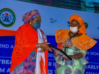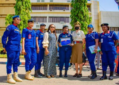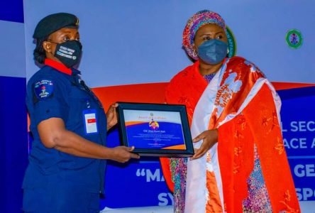 The Special Guest of Honor at the Second Edition of the Annual Conference on Women, Peace and Security Sector Reference Group, held at the National Defence College, Abuja, First Lady of Nigeria, Dr Aisha Buhari, presented an Award of Excellence to the Head of NSCDC Gender unit, CSC ALAO AJET KEMI for exceptional performance of the unit, the Launching of NSCDC Gender Policy and the establishment of the Special Female Squad among others.