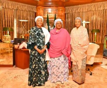 L-R: Wife of the President-elect, Federal Republic of Nigeria, Senator Oluremi Shade Tinubu OON; Wife of the President, Hajia Aisha Buhari and Wife of the Vice President-elect, Hajia Nana Shettima during the duo of Senator Tinubu and Hajia Shettima thank you visit to the wife of the President.