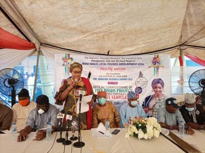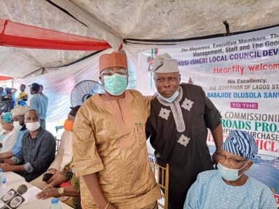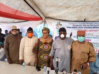 Chairman, Ikosi-Isheri LCDA, Princess Samiat Bada (m); Member, Governor Advisory Council (GAC), APC Lagos State, Alhaji Mutiu Are; Commissioner for Local Government & Community Affairs, Hon. Wale Ahmed and others at the Princess Samiat Bada’s Five (5) Roads Project and Utility Vehicles Commissioning by Gov. Babajide Sanwo-Olu ably represented by Hon. Wale Ahmed