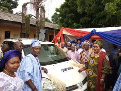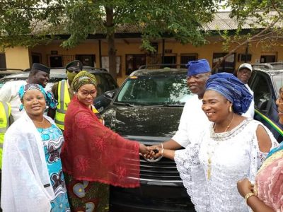 L-R: Commissioner, Lagos State Audit Commission, Hon. Kafilat Ogbara; Chairman, Ikosi-Isheri LCDA, Princess Samiat Bada Presenting A Vehicle Key to the Vice Chairman, Ikosi-Isheri LCDA