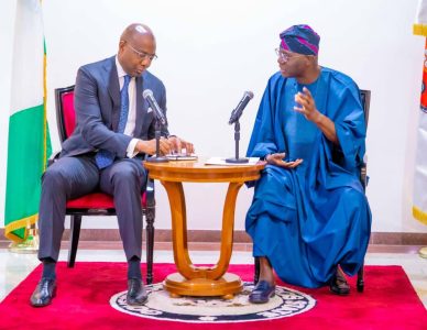 L-R: Co-chair, Lagos International Financial Centre, Mr. Aigboje Aig-Imoukhuede and Governor of Lagos State, Mr. Babajide Sanwo-Olu during a courtesy visit by the delegation from The City UK (TCUK) and LIFC members at the Lagos House, Marina, on Monday, 18 November 2024.