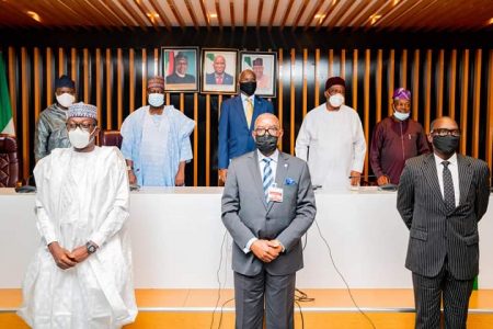 Hon. Minister of Works and Housing, Mr Babatunde Fashola,SAN (middle;top table) and Minister of State in the Ministry, Engr. Abubakar Aliyu (2nd left; top table), Chairman, Senate Committee on Housing and Urban Development, Senator (Dr) Sam Egwu(2nd right),Chairman, House of Representatives Committee on Housing and Habitat,Hon. Mustapha Dawaki(right),Chairman,House of Representatives Committee on Urban Development and Regional Planning, Hon. Jide Jimoh (left), Managing Director/CEO, Federal Housing Authority(FHA), Senator Bareehu Olugbenga Ashafa,(middle; front row), Executive Director, Business Development, Hon. Abudlmumin Jibrin (left; front row) and Executive Director, Housing Finance and Corporate Services, Mr Maurice Ekpenyong (right; front row) in a group photograph shortly after the inauguration of the Executive Management Team of the Federal Housing Authority (FHA) at the Ministry of Works and Housing Headquarters, Mabushi, Abuja on Thursday, 13th August 2020.