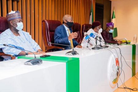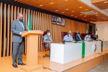 Hon. Minister of Works and Housing, Mr Babatunde Fashola,SAN(2nd left) and Minister of State in the Ministry, Engr. Abubakar Aliyu(left), Chairman, Senate Committee on Housing and Urban Development, Senator (Dr) Sam Egwu (2nd right) and Chairman, House of Representatives Committee on Housing and Habitat,Hon. Mustapha Dawaki (right) during the inauguration of the Executive Management Team of the Federal Housing Authority (FHA) at the Ministry of Works and Housing Headquarters, Mabushi, Abuja on Thursday, 13th August 2020.