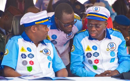 L-R: Commissioner for Transport, Dr. Frederic Oladeinde; Lagos State Deputy Governor, Dr. Obafemi Hamzat; Governor Babajide Sanwo-Olu and Managing Director/CEO, Lagos Ferry Services (Lagferry), Hon. Abdoulbaq Balogun during the launch of Lagferry operations, Mobile App and new Boats at Badore Ferry Terminal, Ajah, on Tuesday, February 4, 2020.
