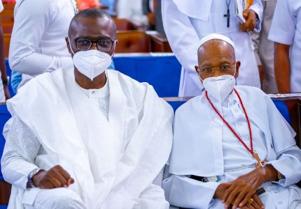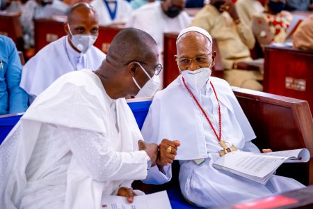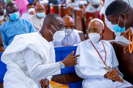 L-R: Lagos State Governor, Mr. Babajide Sanwo-Olu with the Prelate Emeritus of the Methodist Church of Nigeria, His Eminence, Dr. Sunday Mbang during the 85th Birthday Celebration of the Prelate Emeritus at the Methodist Church of the Trinity, Tinubu, Lagos, on Sunday, August 29, 2021.