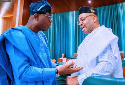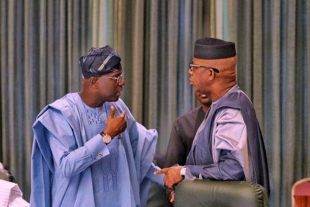 L-R: Lagos State Governor, Mr. Babajide Sanwo-Olu, in a discussion with his Ogun State counterpart, Prince Dapo Abiodun at the National Economic Council meeting, held at the Presidential Villa, Abuja on Thursday, February 27, 2020.