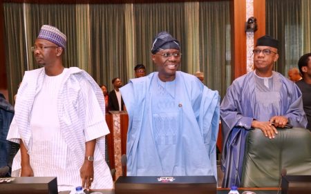 L-R: Governor of Nasarawa State, Engr. Abdullahi Sule; Lagos State Governor, Mr. Babajide Sanwo-Olu and Ogun State Governor, Prince Dapo Abiodun during the National Economic Council meeting at the Presidential Villa, Abuja on Thursday, February 27, 2020.
