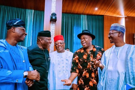 L-R: State Governors – Mr. Babajide Sanwo-Olu (Lagos); Dr. Kayode Fayemi (Ekiti); Engr. Dave Umahi (Enugu); Mr. Douye Diri (Bayelsa) and Engr. Abdullahi Sule (Nasarawa), at the National Economic Council meeting, held at the Presidential Villa, Abuja on Thursday, February 27, 2020
