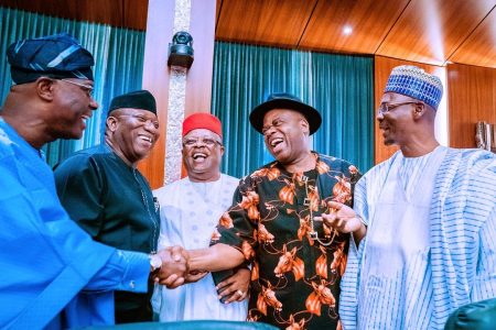 L-R: State Governors – Mr. Babajide Sanwo-Olu (Lagos); Dr. Kayode Fayemi (Ekiti); Engr. Dave Umahi (Ebonyi); Mr. Douye Diri (Bayelsa) and Engr. Abdullahi Sule (Nasarawa), at the National Economic Council meeting, held at the Presidential Villa, Abuja on Thursday, February 27, 2020