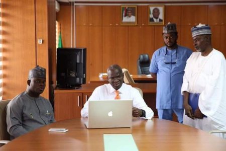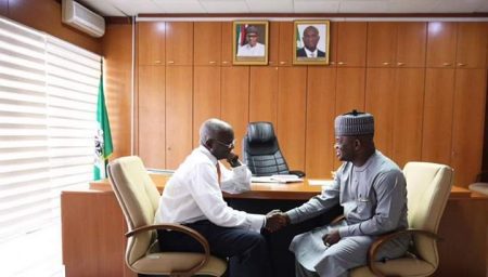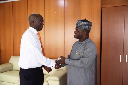 L-R: Governor, Kogi State, Alhaji Yahaya Bello with Honourable Minister, Mr. Babatunde Raji Fashola, SAN during a courtesy Visit by Gov. Bello to Fashola in Abuja.