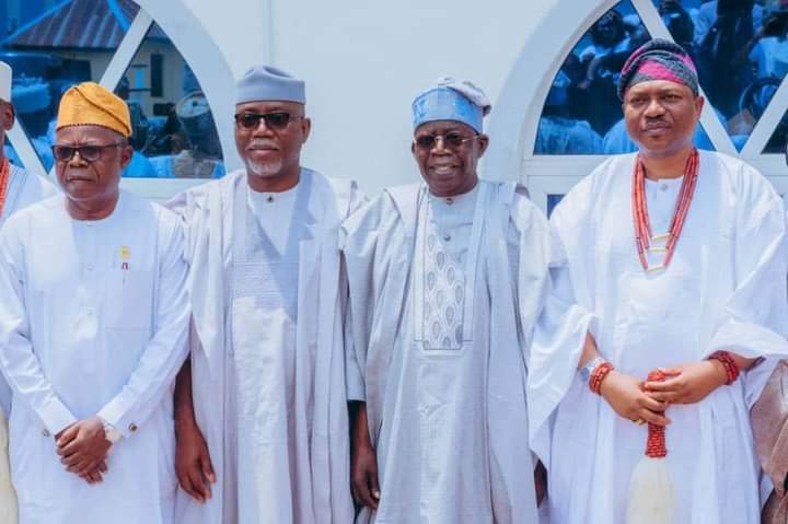 L-R: Deputy Governor, Ondo State, Hon. Olayide Adelami; Governor, Ondo State, Governor Lucky Orimisan Aiyedatiwa; President Bola Ahmed Tinubu and Olowo of Owo Kingdom.