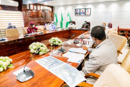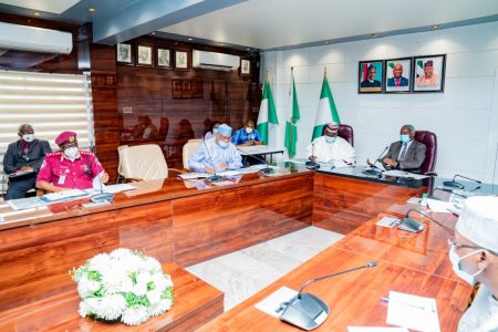 Hon. Minister of Works and Housing, Mr Babatunde Fashola,SAN (middle), Minister of State in the Ministry, Engr. Abubakar Aliyu (4th left), Acting Permanent Secretary, Ministry of Works and Housing, Engr. Yemi Oguntominiyi (right) , Managing Director, Federal Roads Maintenance Agency (FERMA), Engr. Nuruddeen Rafindadi (3rd left) ,Corps Marshal of the Federal Road Safety Corps (FRSC) , Dr Boboye Oyeyemi (2nd left) and others during a Special Meeting on the Partial Closure of the Third Mainland Bridge to discuss Traffic Diversion/Provision of Alternative Routes for Ease of Movement for Road Users within the Lagos Metropolis at the Ministry of Works and Housing Headquarters, Mabushi, Abuja on Tuesday, 14th July 2020.